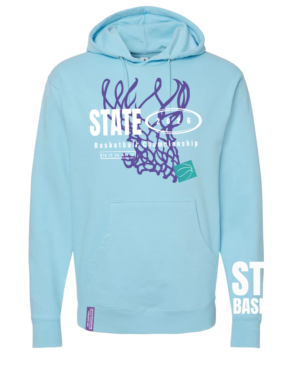 The In It To Win It Hoodie features bold front and back artwork with a screen printed sleeve, combining screen print and embroidery on a light blue hoodie designed to stand out on and off the court.